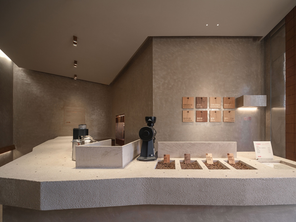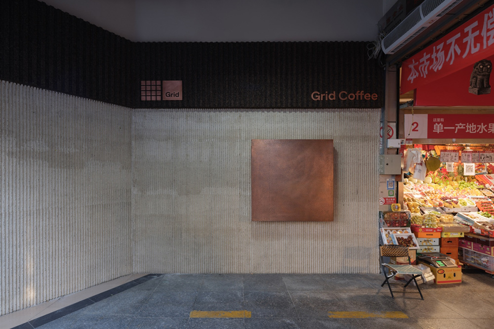 Given the unique refinement and fashion sensibilities inherent in the SanYuanLi Market, coupled with the distinctive stand-and-sip and all-you-can-eat coffee experience offered by Grid Coffee, establishing a distinctive ambiance is crucial for this project. The entrance façade features what appears to be a random and fortuitous design, highlighting a naturalistic and artistic sensibility. The shape formed by the concrete resembles a framing element, capturing people in the market as they relax and enjoy coffee. The handcrafted copper door, in contrast with the rough and weighty concrete, creates a visually striking contrast, allowing it to stand out in the lively street scene without dominating the overall space.