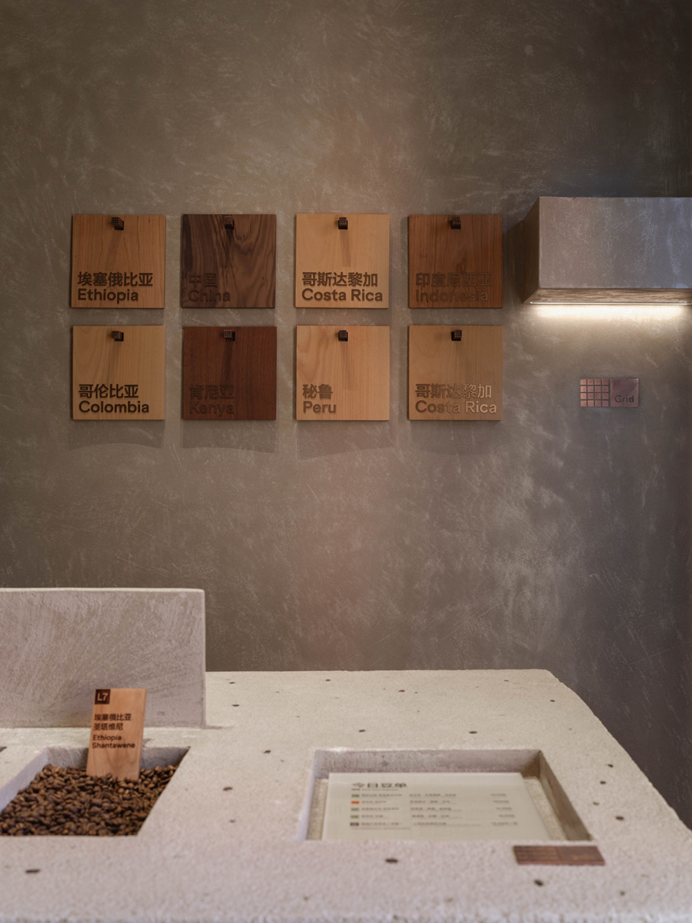 The indoor bar’s countertop serves as the most interactive surface for customers. Reflecting Grid Coffee’s commitment to single-origin coffee, we collected brand coffee beans. Through multiple prototyping iterations, we blended theses beans with aggregates to achieve a randomly scattered effect on the appearance. This addition introduces an element of fun to the coffee tasting experience.