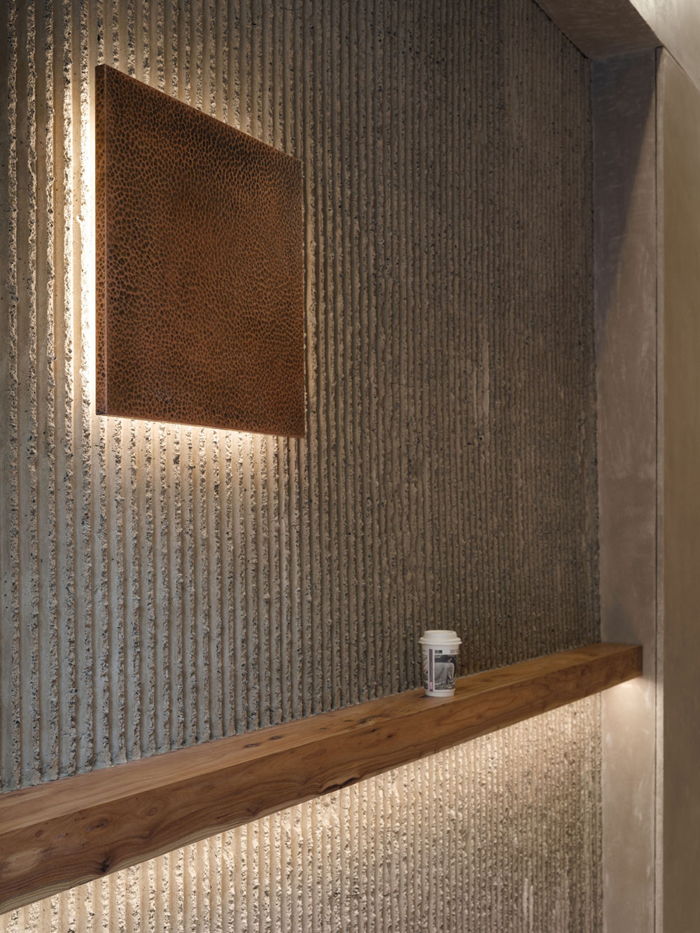 The hand-cast ribbed façade exposes aggregates, emphasizing edges and creating a distinctive texture. For the surfaces directly touched by customers, including storage tables and backrests, we chose elm wood. The traces of time on the wood impart an imperfectly pristine quality yet exuding a warm atmosphere.