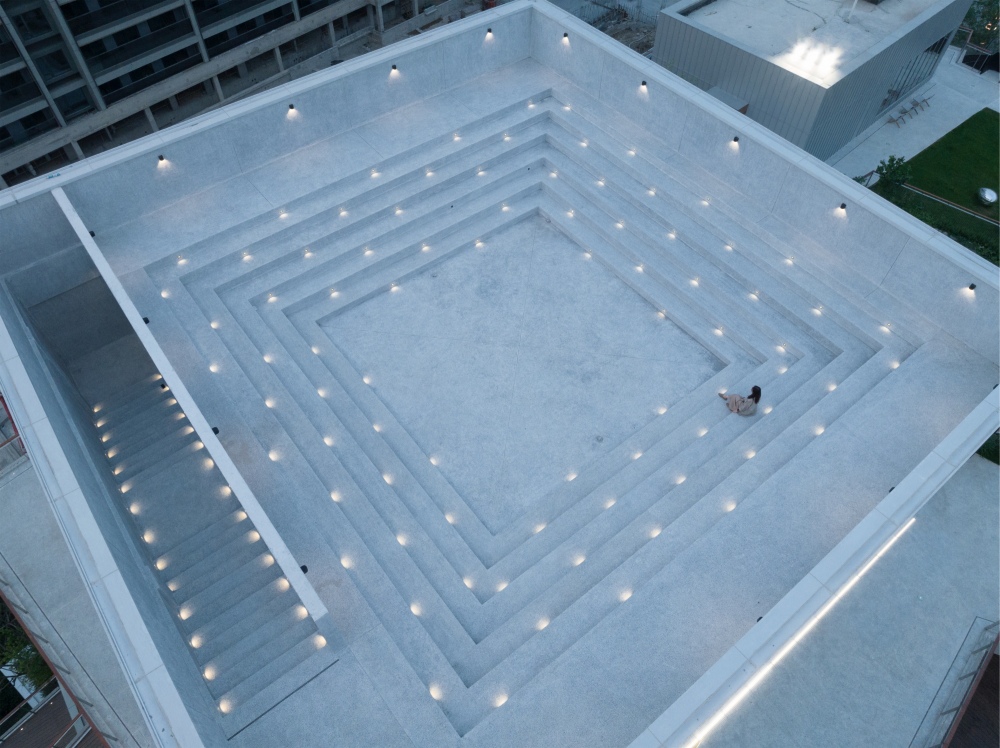When the breeze comes and sunlights pours in, the sense of nature flows in the space. Meanwhile, the tall and open holes become the major visual focus inside the architecture. The steps going down from the first floor connects the semi-underground space and the square, eliminating the height difference and transforming it into an area for seating, seeing and activity. In this way, the space has various possibilities for use. The top wall of the fourth-floor large box is designed to be high to lead people’s sight inward and upward. People can stay in a ceremonial theater feeling the sky and the earth. Facing the sky at the highest point of the architecture, people get to experience the end of the