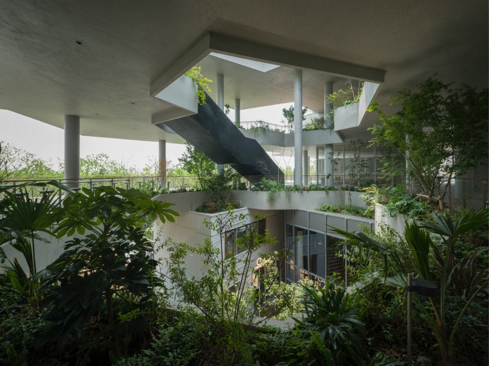 Trees are planted on the roof space which is created by stacked floor slabs and staggered boxes, forming a rooftop forest scattered on the building. Irregular-shaped holes are cut around the atrium, running from the ground floor to the roof, establishing intersecting lines of sight. We choose to leave some gaps around the atrium to grow bushes and ground cover plants. When standing in the semi-underground space and the grey spaces on each floor, people can see the layered greenery.